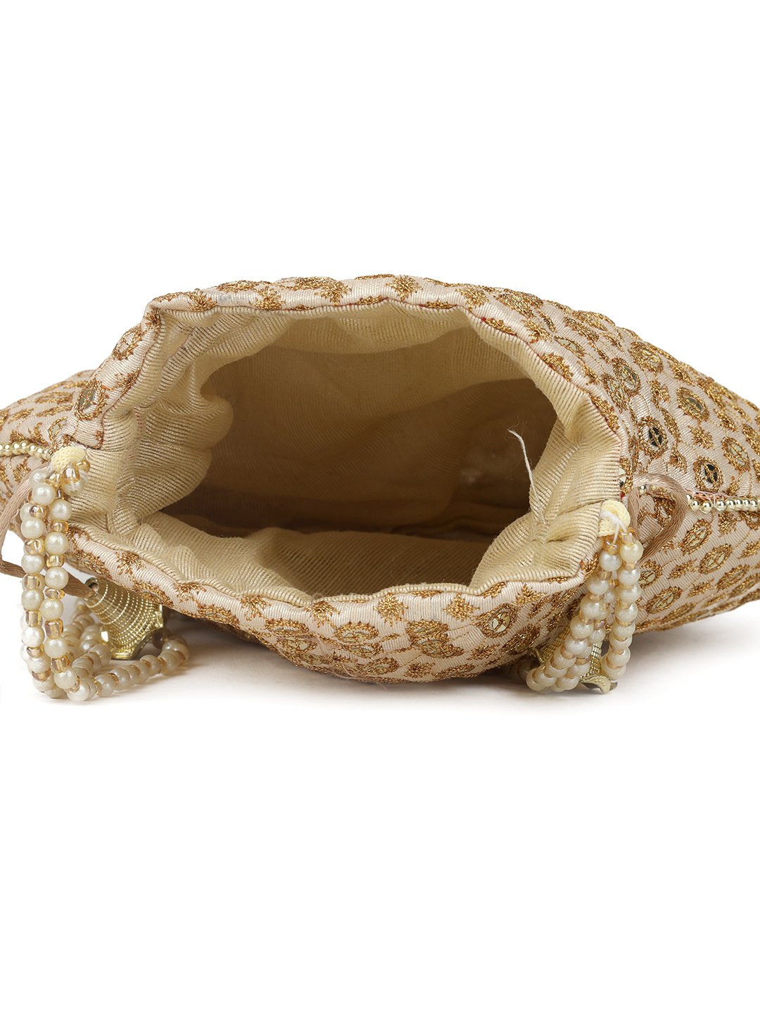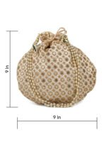 Golden embellished potli Has wrist loop 1 main compartment with drawstring closure Size & Fit Size : 9 x 9 x 3 Inch (Length x Width x Depth ) Material & Care Fabric Wipe with clean, dry cloth