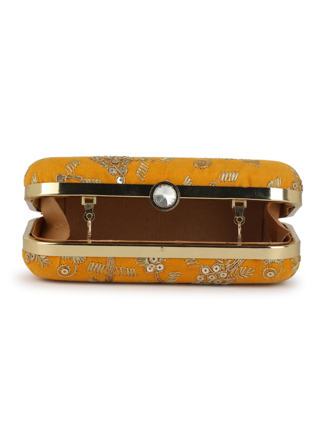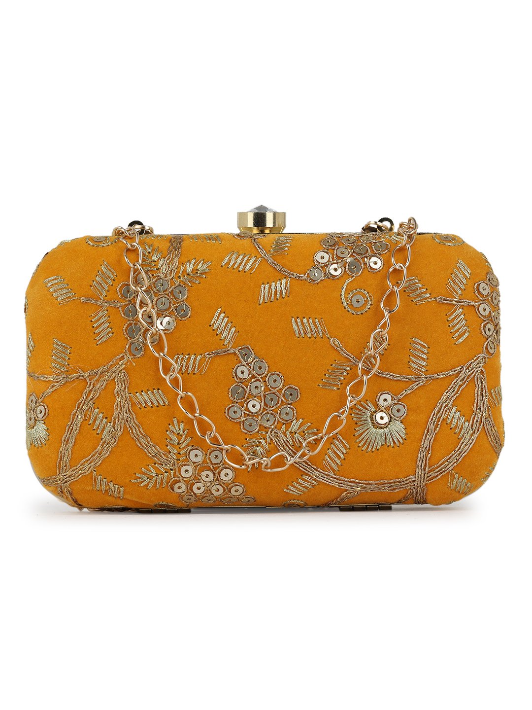 Mustard Embroidered Box clutches, Has gold chain shoulder strap, 1 main compartment with twist closure