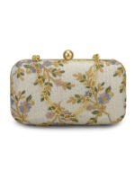 White & Gold Embroidered Clutch 1 Main compartment with click closure has detachable shoulder strap