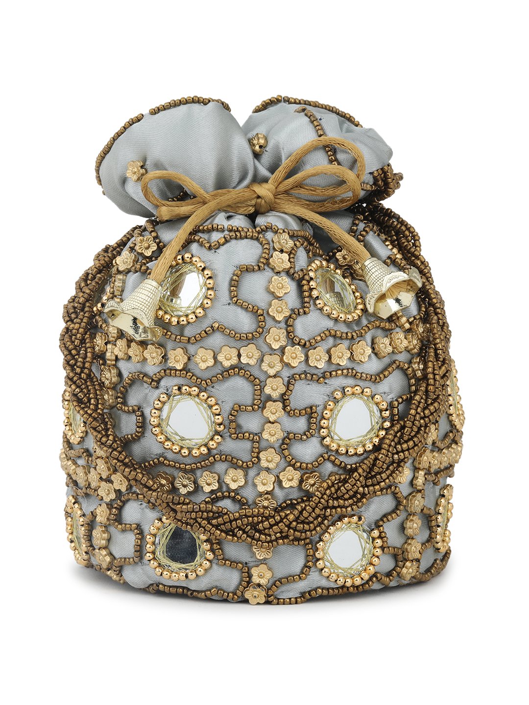 White & Gold-toned embellished potli Has wrist loop 1 main compartment with drawstring closure Size & Fit Size : 9 x 9 x 3 Inch (Length x Width x Depth ) Material & Care Fabric Wipe with clean, dry cloth