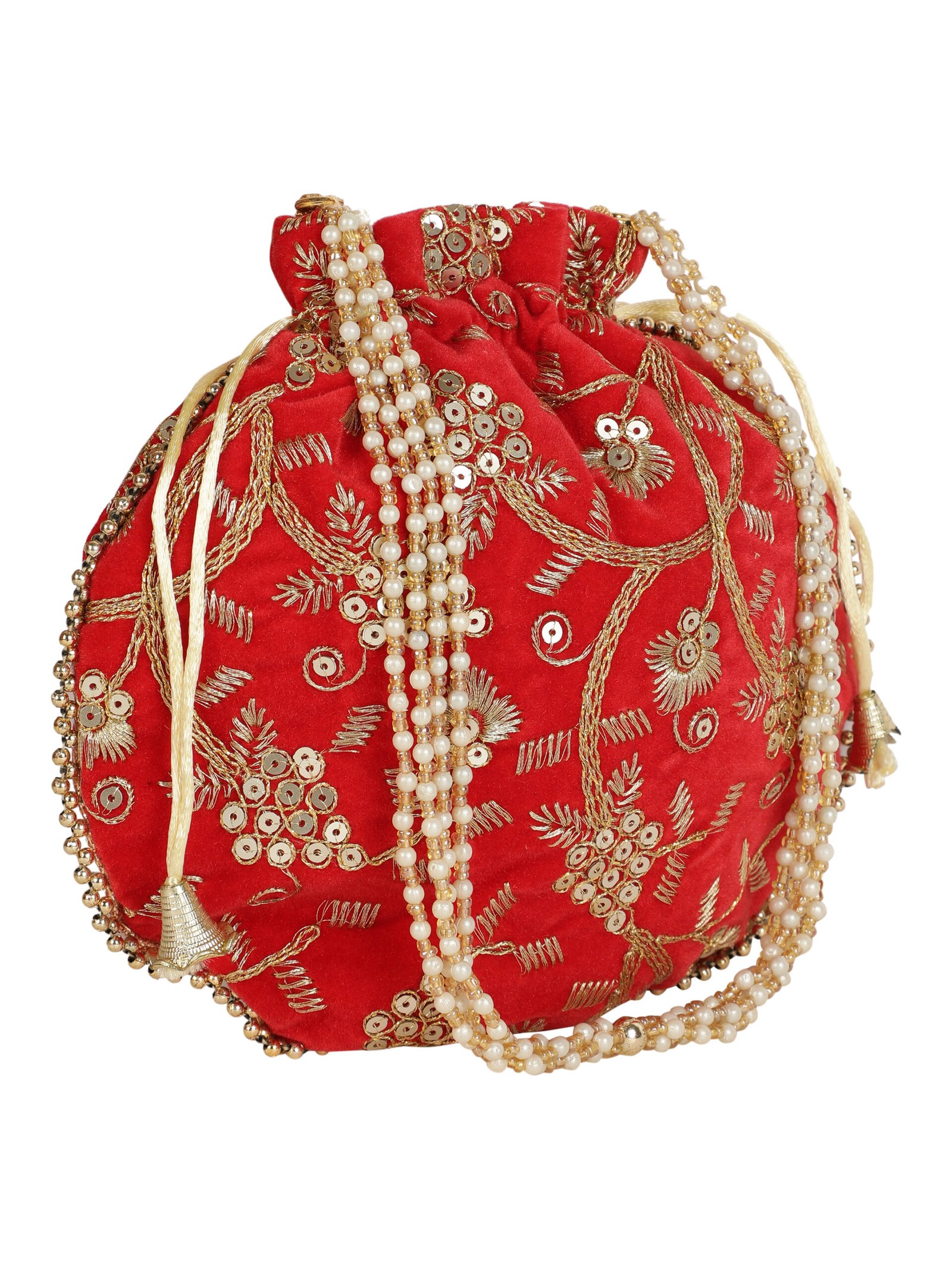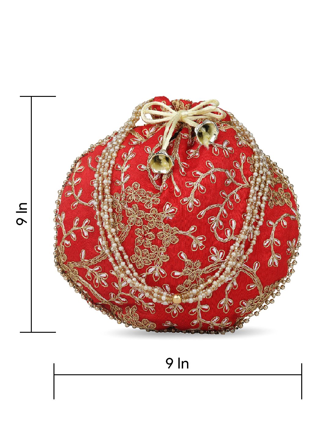 Red Embroidered Potli With Wrist Loop Has wrist loop 1 main compartment with drawstring closure Size & Fit 18x2x10 cm Material & Care Fabric Wipe with clean, dry cloth