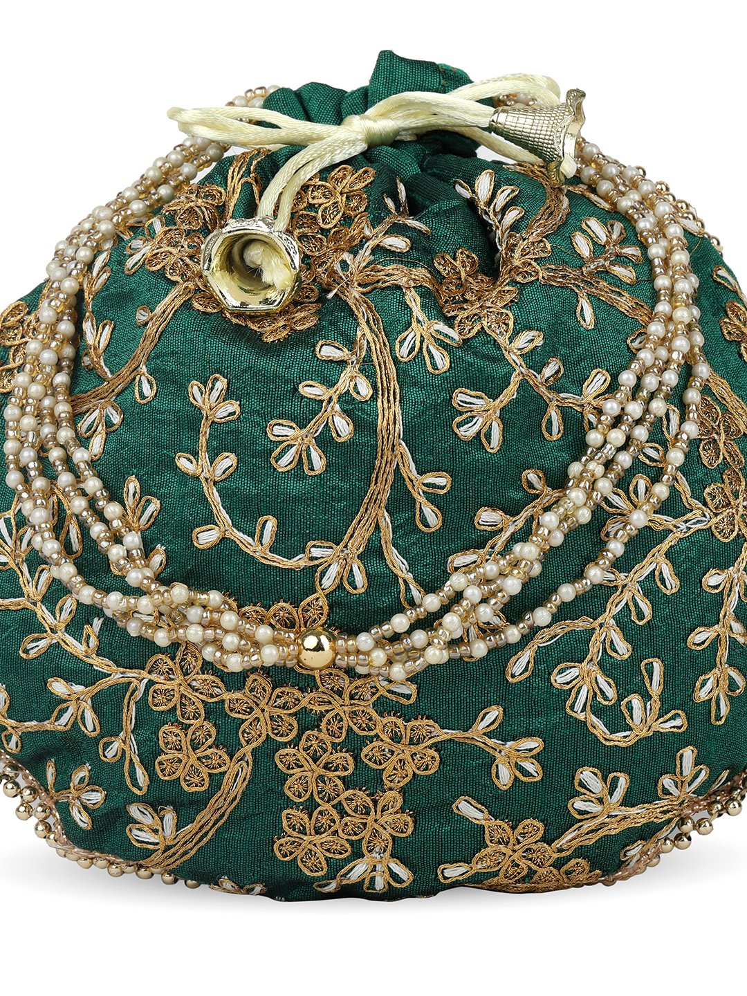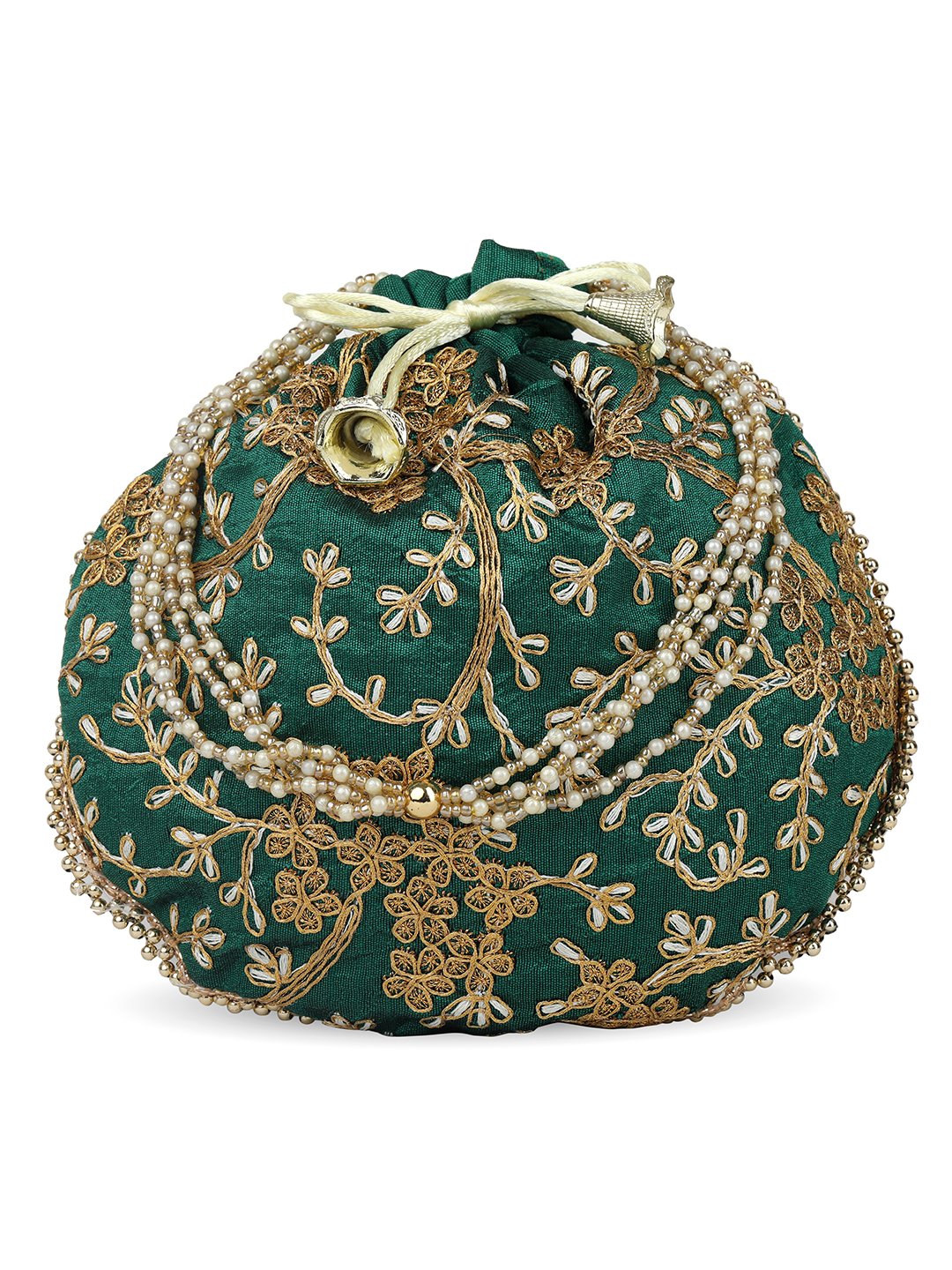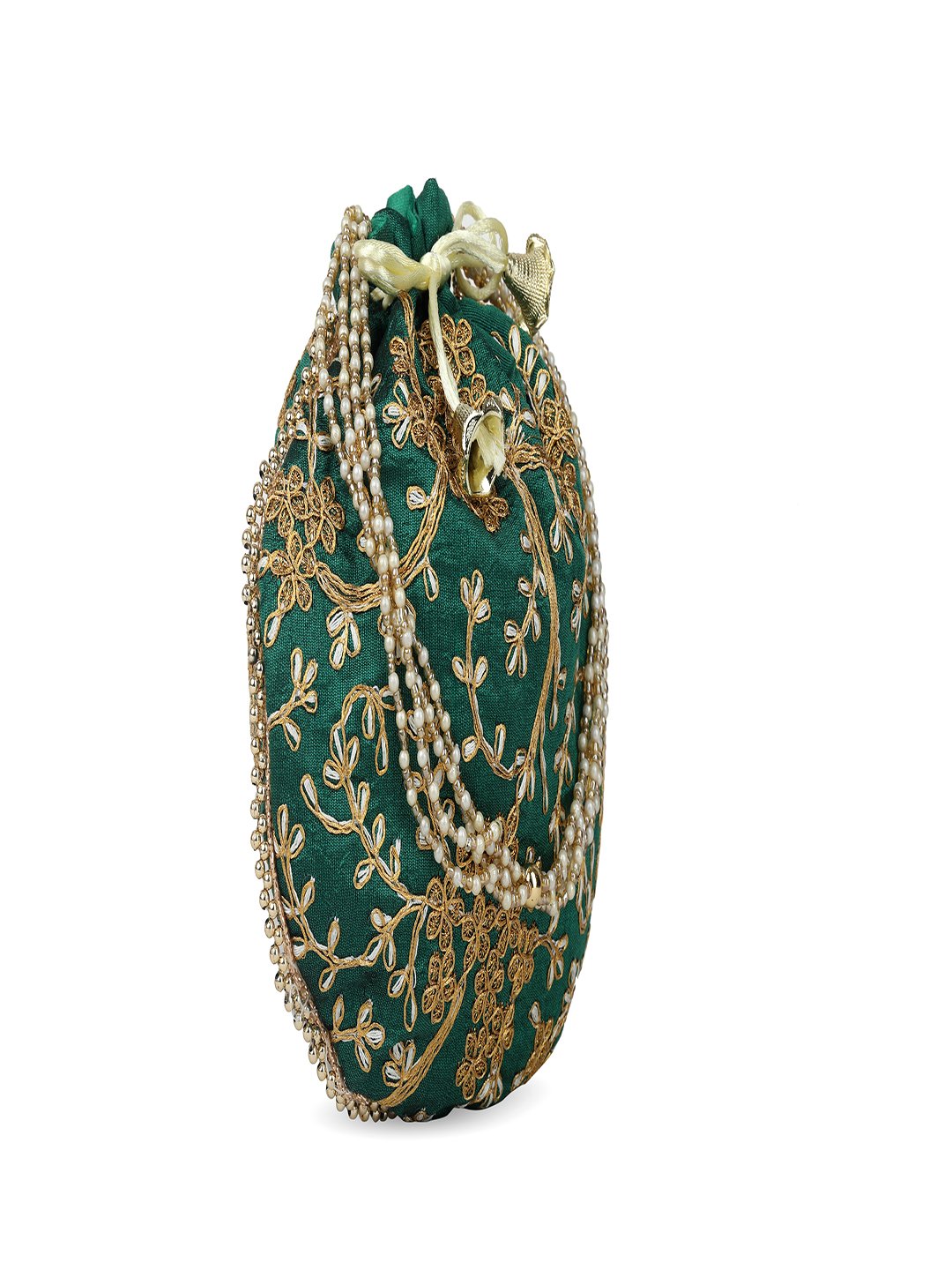 Green embellished potli Has wrist loop 1 main compartment with drawstring closure Size & Fit Size : 9 x 9 x 3 Inch (Length x Width x Depth ) Material & Care Fabric Wipe with clean, dry cloth